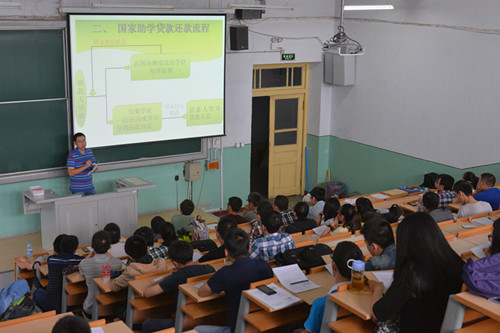说明会主要分为四个方面进行,首先张老师再次和大家一起回顾了国家助学贷款的相关政策,指出国家助学贷款是国家对家庭经济困难学生的莫大帮助,是为大家顺利完成在校学业保驾护航。助学贷款是大学生以个人信用向银行获得的贷款,能否按时按期还贷在大学生将来的工作和生活中会起到重要的作用。恪守诚信,按时还款,如期履约,是我们的义务,也是我们对国家、社会和学校的回报。张老师还用实际例子对我国的征信系统进行了介绍,强调了个人诚信的重要性,详细说明了及时还款对个人信用以及出国、贷款、就业、买房等等方面的重要影响,还特别提示一定要与老师保持联络,便于助学贷款相关政策的传达。随后,张老师还向贷款毕业生宣传了国家助学贷款代偿政策,鼓励贷款毕业生到基层就业,并发放了《中国银行贷款还款须知》,《贷款毕业生信息卡》,分别介绍了升学展期,提前还贷,就业还款等不同情况下应当办理的贷款流程。接下来,当场收集了贷款毕业生的信息,并特别就还贷的不同方式和毕业生离校前需要在学校进行的还款确认手续进行了介绍。