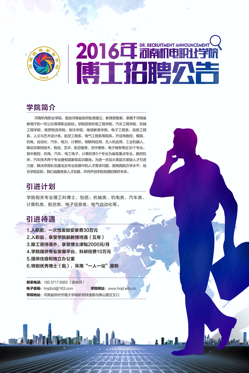 河南机电职业学院(www.hnjd.edu.cn),是由河南省政府批准建立、教育部备案、隶属于河南省教育厅的一所公办高等职业院校。学院现有机电工程学院、汽车工程学院、机械工程学院、商贸物流学院、制冷学院、继教育学院、电子工程系、信息工程系、人文与艺术设计系、航空工程系、电气工程系等院系。开设有数控、模具、机电、自动化、汽车、电力、计算机、物联网应用、无人机应用、工业机器人、移动互联网技术、物流、艺术、航空服务、空中乘务、电子商务等近30个专业。其中数控、机电、汽车、电工电子、计算机等5个专业为省级重点专业。数控机床、汽车技术两个专业建有国家级实训基地。为进一步加大高层次紧缺人才引进力度,解决师资队伍建设及专业发展中的人才需求问题,提高我院办学水平,结合学院实际,我们诚邀各类人才加盟,共同开创学院发展的美好未来。