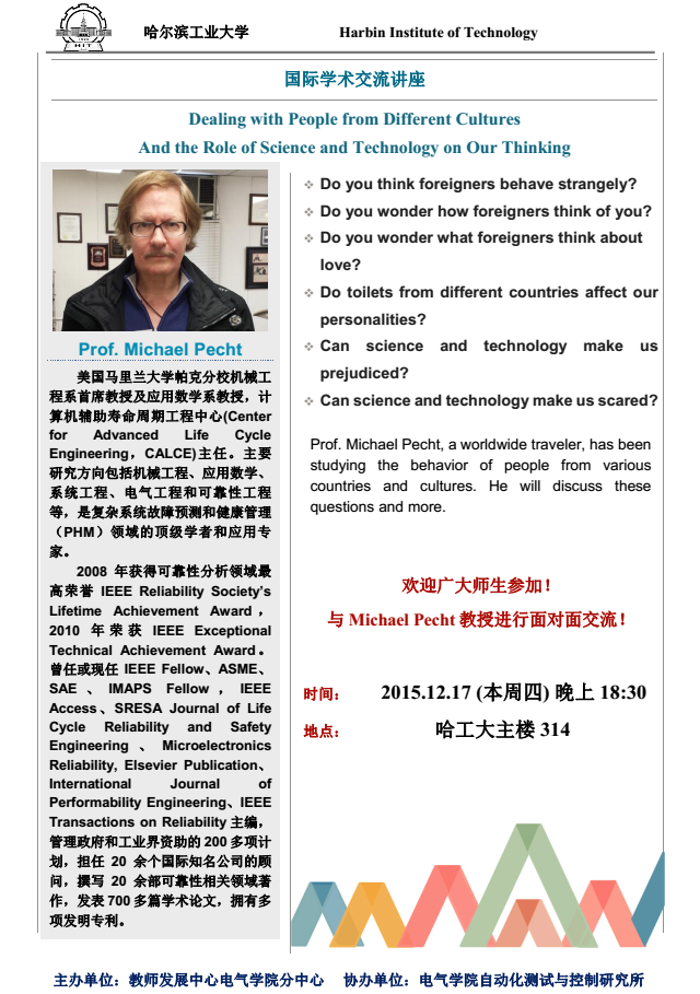 为了鼓励广大师生积极开展国际交流,克服国际交流过程中可能遇到的困难,充分理解和学习在国际学术交流需要关注的问题,积极拓展国际交流视野和渠道,提升国际学术交流能力,依托哈工大教学发展中心电气分中心,受自慰喷水 的邀请,美国马里兰大学(University of Maryland)机械工程系首席教授Michael Pecht来自慰喷水 做特邀报告。