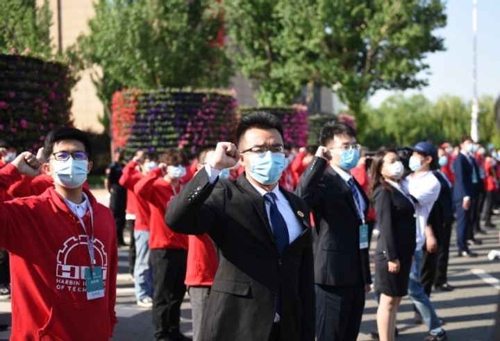 在全国优秀共青团员、玄智科技创业团队负责人李蕴洲领誓下,“云端”和参加升旗仪式的全体学生高举右拳大声宣誓。
